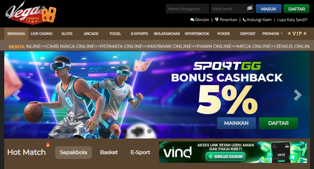 Vegas88 adalah situs betting online terbaik yang menyediakan berbagai permainan seperti slot, sportsbook, live casino, dan game arcade dengan sistem keamanan modern serta dukungan pelanggan 24 jam.